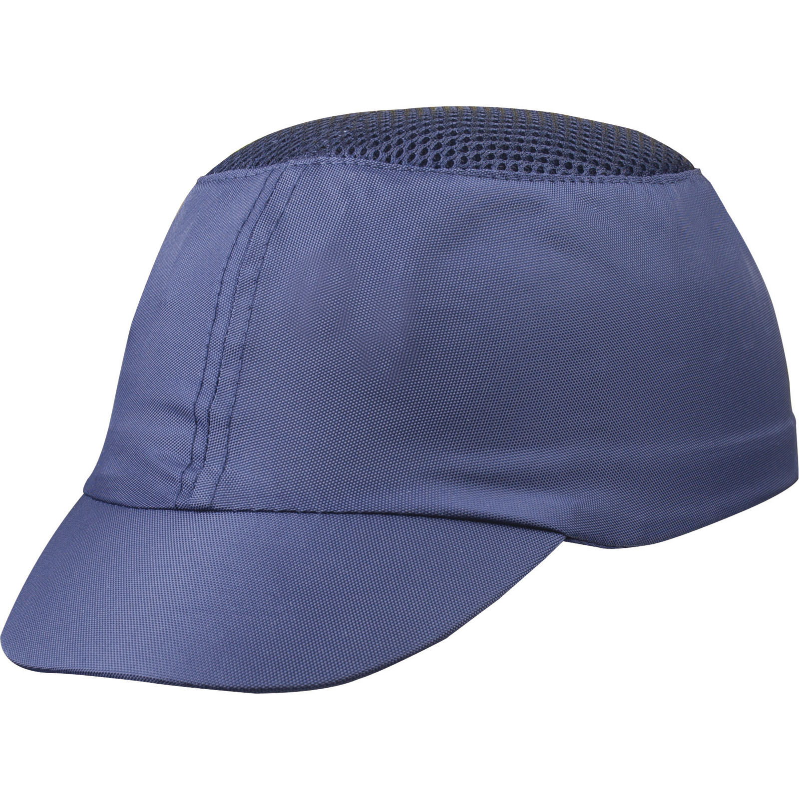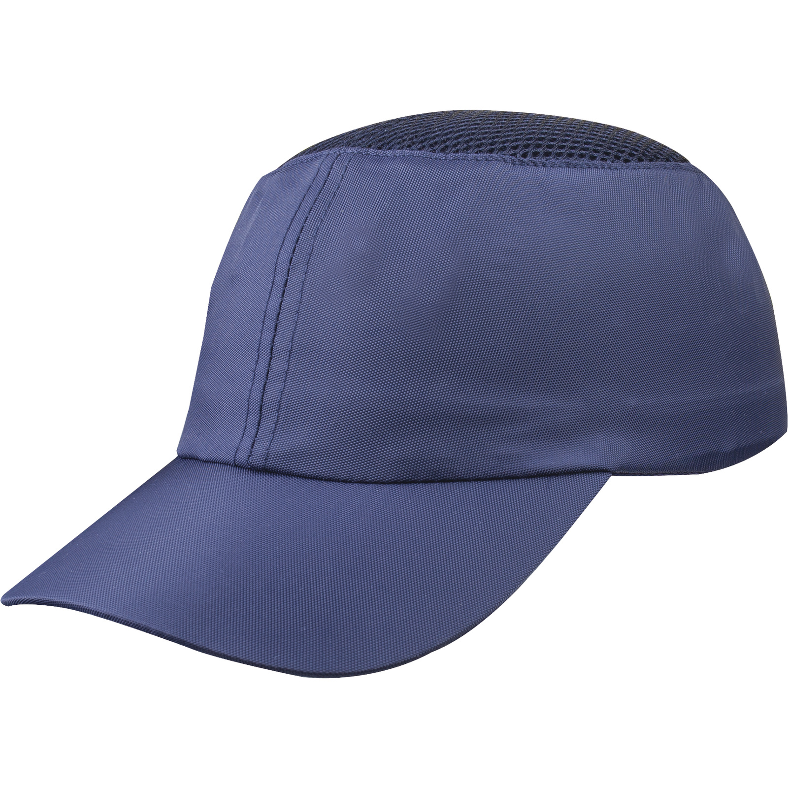 Impact resistant baseball style bump cap in polyester. Highly ventilated polyurethane coated polyester with mesh fabric on top part for more comfort. Lined with polyethylene and comfortable EVA foam shell to absorb shocks. Adjustable size by buckle 55/62 cm.