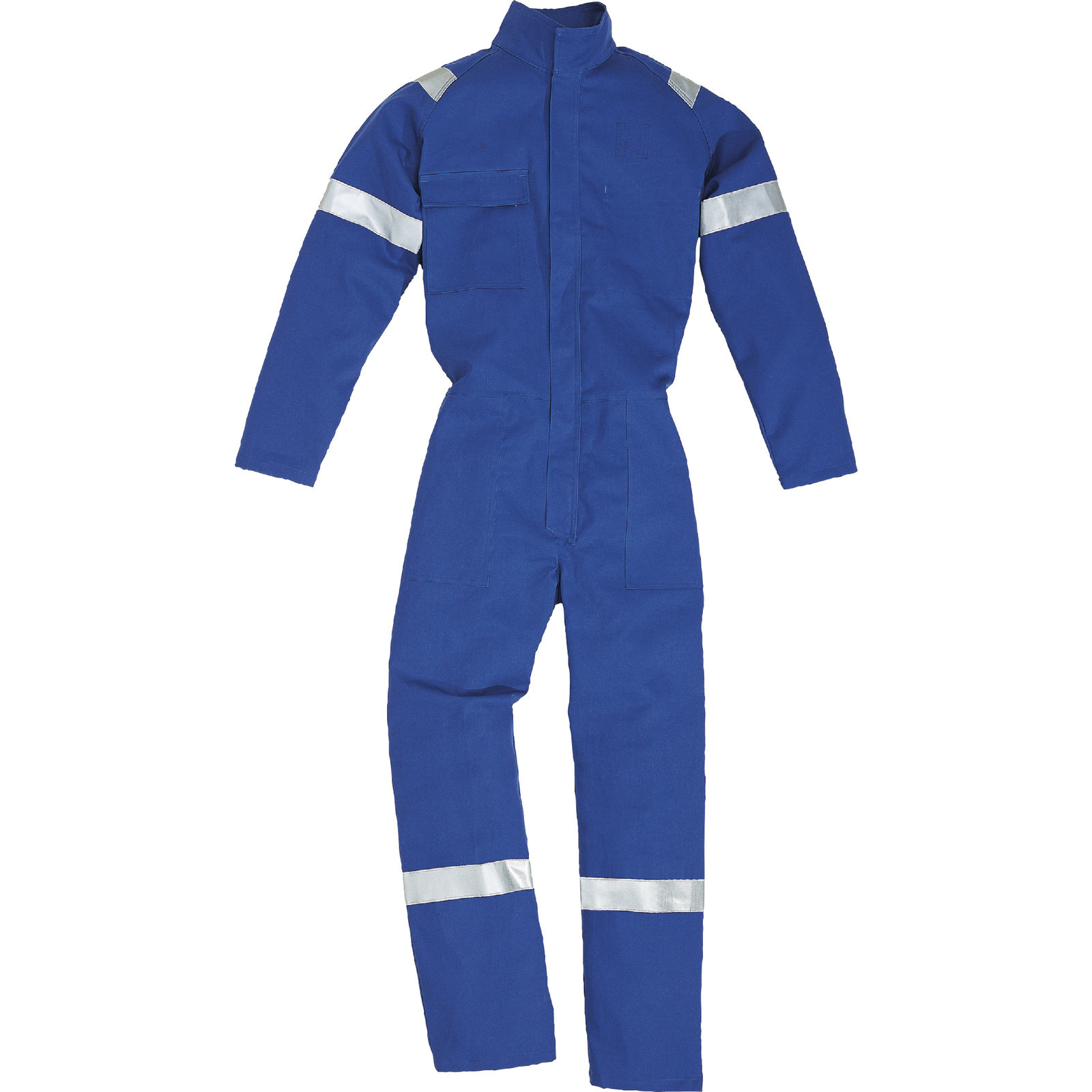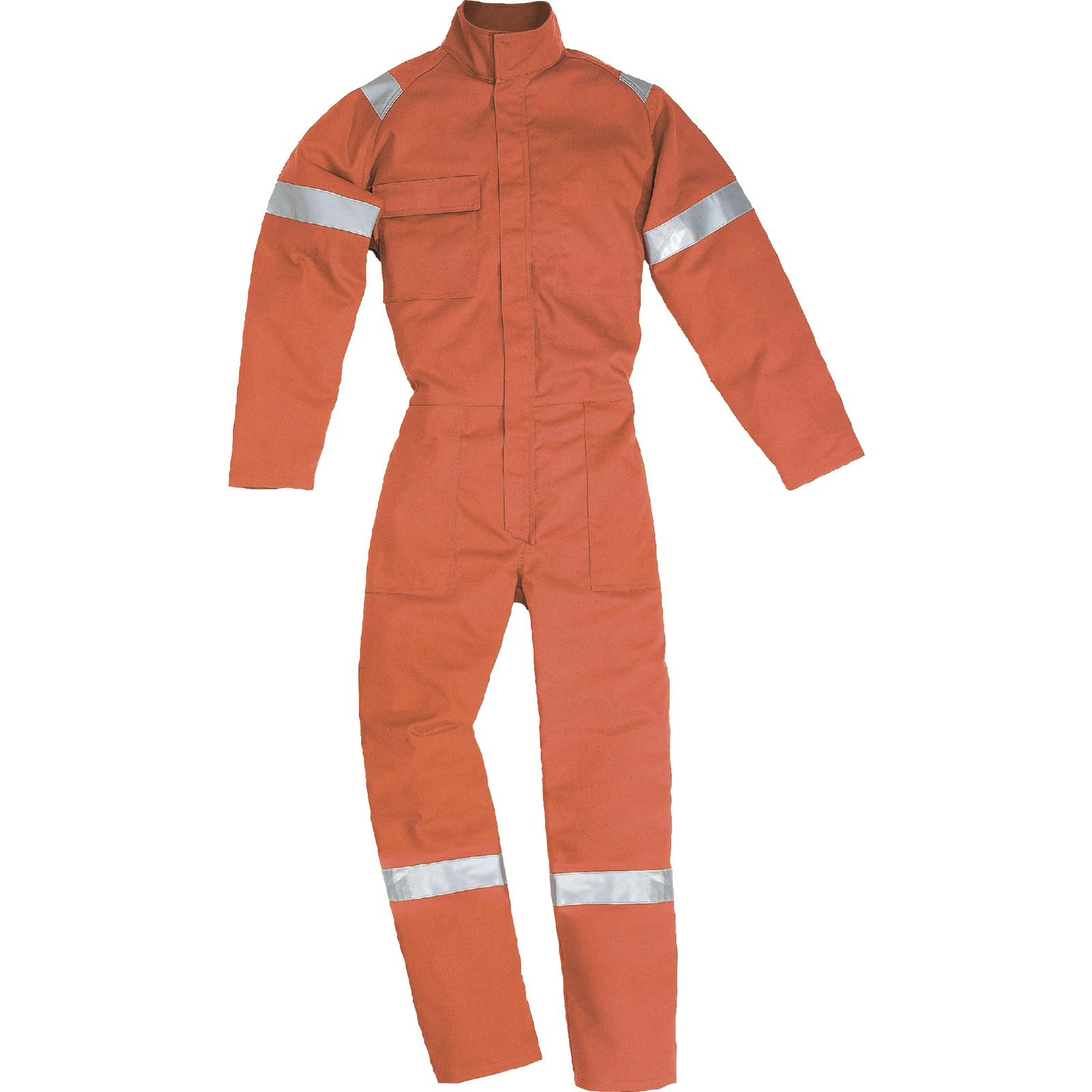 Combinaison en coton ignifugé Proban® 315 g/m². Col tailleur. Fermetures du cou à la braguette en plastique de même couleur .Réglage pieds de pantalon à partir de mi tibia par fermetures à glissière plastique .Une bande réfléchissante horizontale au niveau des tibias ; aux bras ( niveau biceps ) et sur la taille . 8 poches ( 4 avants ; 2 arrières et 2 de type « camouflé » ) .Serrage au poignet par fermeture à glissière plastique .